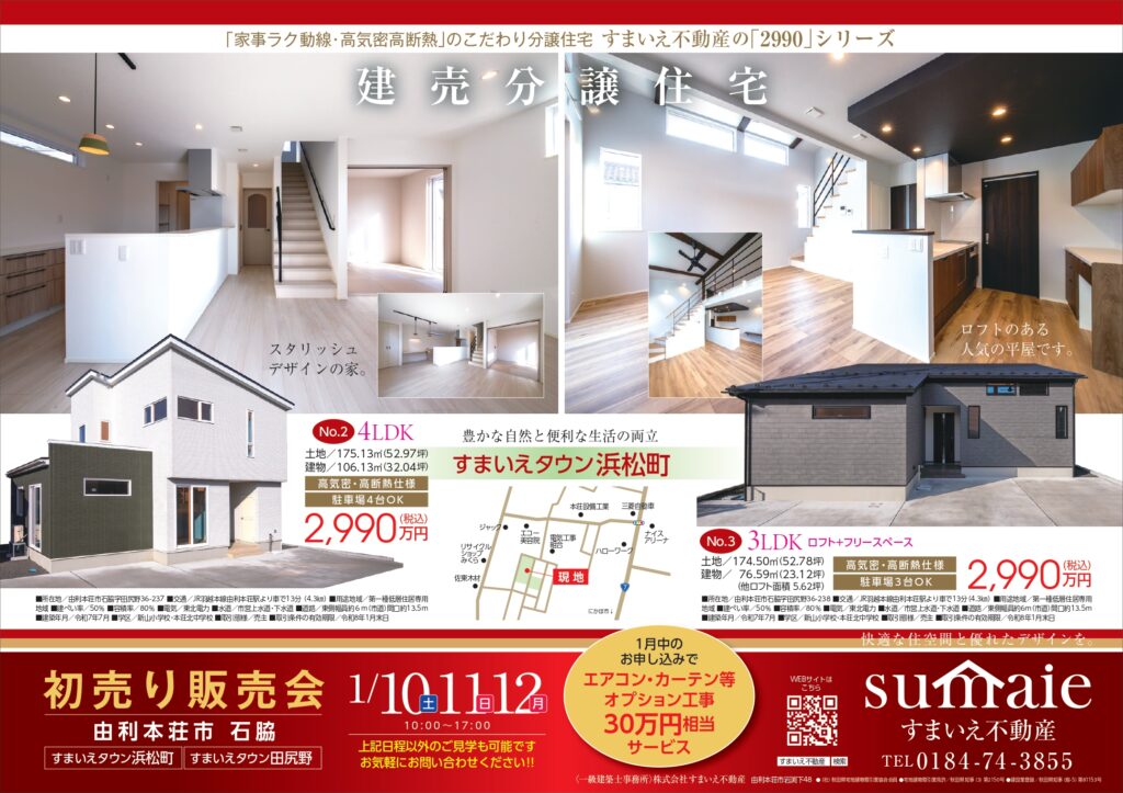ぜひこの機会に「家事ラク動線・高気密高断熱」のすまいえ2990シリーズをはじめ、当社のこだわり分譲住宅に足をお運びください♪